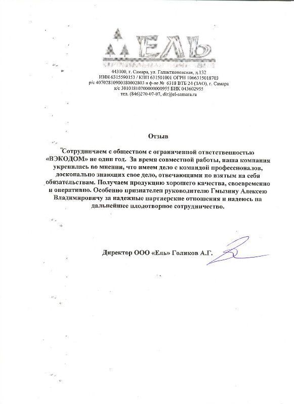 Сотрудничаем с ООО "ВЭКОДОМ" не один год. За время совместной работы наша компания убедилась во мнении, что имеем дело с командой профессионалов, досконально знающих свое дело, отвечающими по взятым на себя обязательствам. Получаем продукцию хорошего качества, своевременно и оперативно. Особенно признателен руководителю Гмызину Алексею Владимировичу за надежные партнерские отношения и надеюсь на дальнейшее плодотворное сотрудничество.