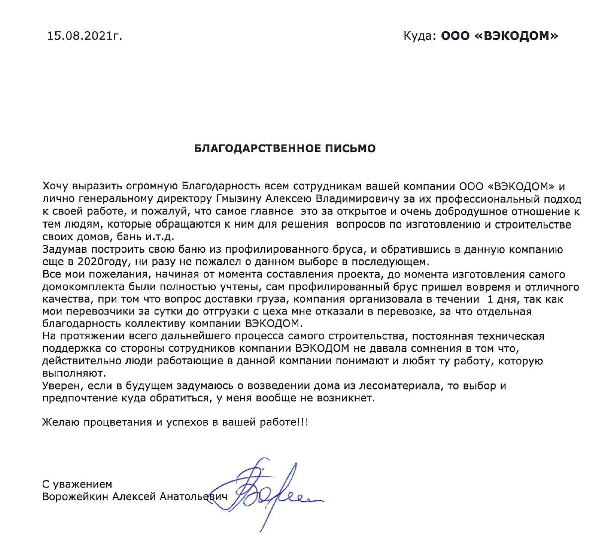 Хочу выразить огромную Благодарность всем сотрудникам вашей компании ООО «ВЭКОДОМ» и лично генеральному директору Гмызину Алексею Владимировичу за их профессиональный подход к своей работе, и пожалуй, что самое главное это за открытое и очень добродушное отношение к тем людям, которые обращаются к ним для решения вопросов по изготовлению и строительстве своих домов, бань и.т.д.