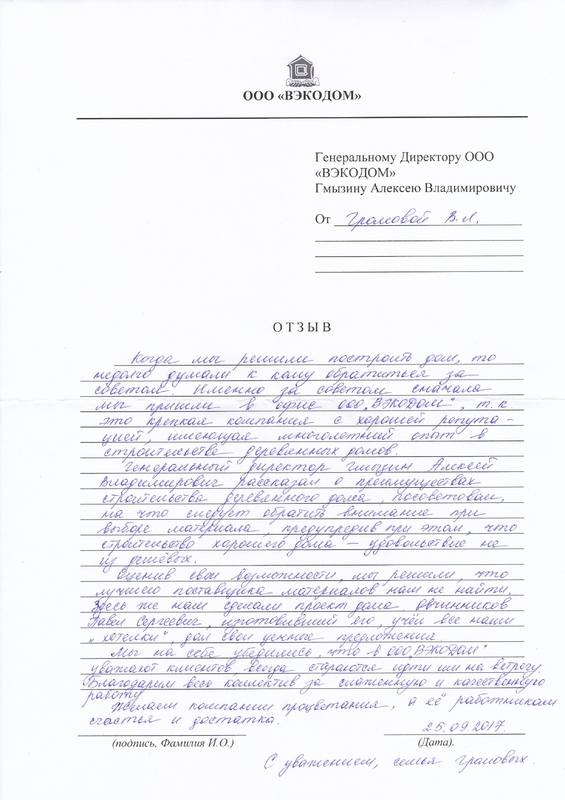 Когда мы решили построить дом, то недолго думали к кому обратиться за советом. Именно за советом сначала мы пришли в офис ООО "ВЭКОДОМ", т.к. это крепкая компания с хорошей репутацией, имеющая многолетний опыт в строительстве деревянных домов.