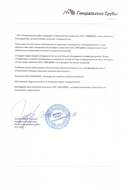 ПСК «Генеральские срубы» выражает искреннюю благодарность ООО «ВЭКОДОМ». Наша компания благодарит Вас за многолетнее успешное сотрудничество.