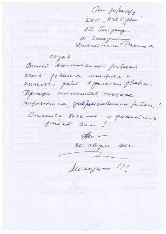 Вашей выполненной работой очень доволен, материал и качество работ в должном уровне. Бригада специалистов, очень старательна, добросовестная работа. Успехов Вам!